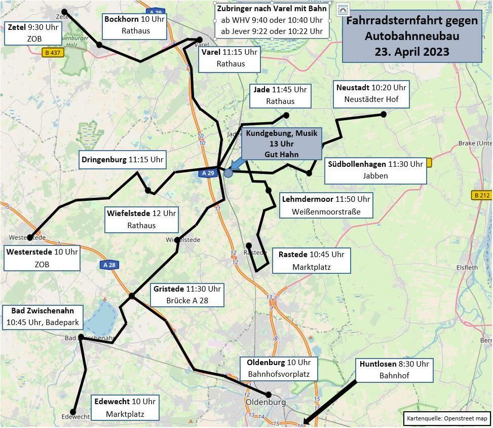 Insgesamt haben die Veranstalter 16 Treffpunkte im Ammerland, Friesland, der Wesermarsch und Oldenburg geplant. Gemeinsames Ziel ist um 13 Uhr eine Kundgebung auf dem Gut Hahn bei Rastede, in unmittelbarer Nähe zur geplanten Autobahntrasse. Neben Reden gibt es dort auch Musik von Cheyenne und Inga Rumpf.