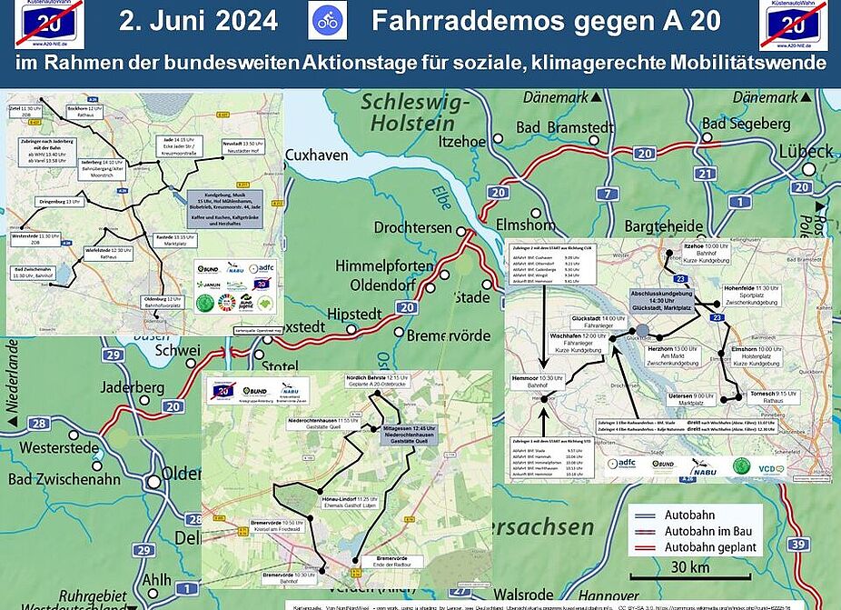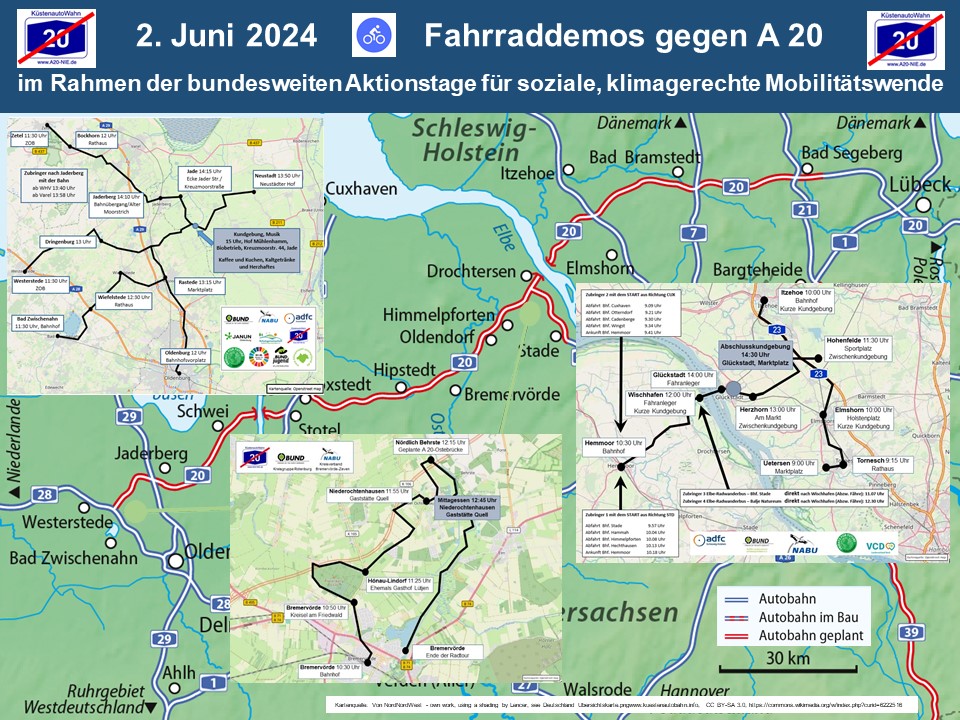 Am Sonntag, den 2. Juni 2024, lädt ein breites Bündnis zu einer bunten Fahrradsternfahrt für die Verkehrswende und gegen die geplante A20 ein. Sammelpunkte gibt es u.a. in Oldenburg, Bad Zwischenahn, Wiefelstede, Westerstede und Rastede.