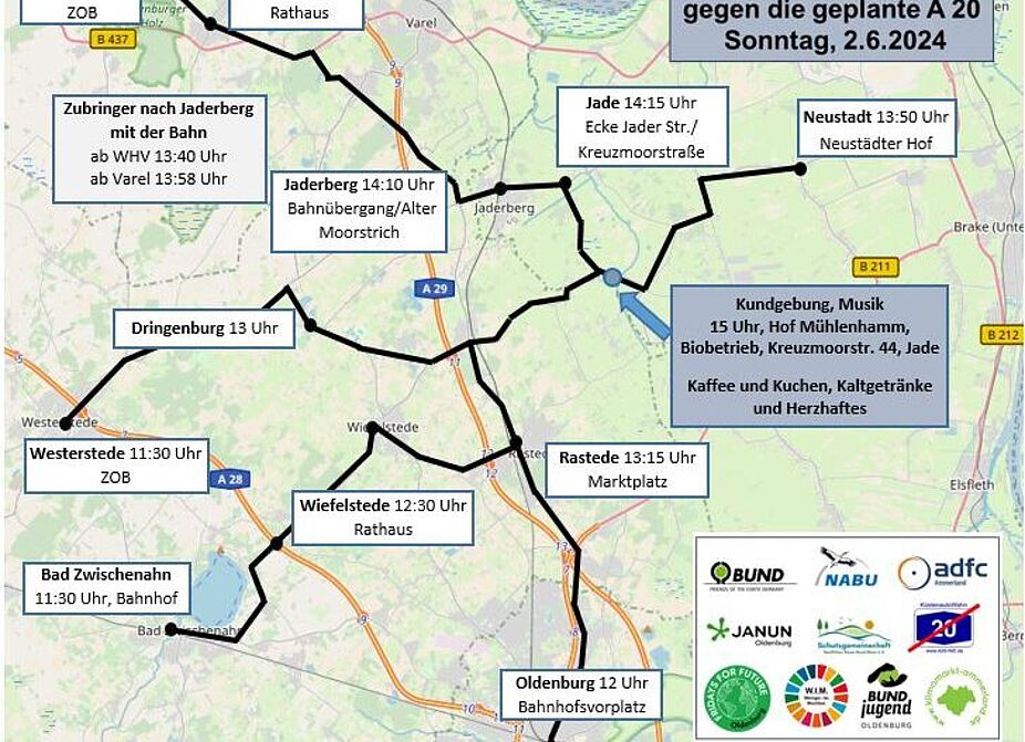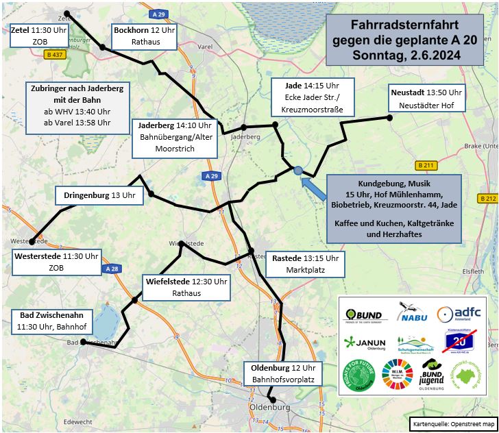 Die gemeinsame Sternfahrt für das Ammerland, Oldenburg, Friesland und Wesermarsch führt zum Hof Mühlenhamm, dem Biohof der Familie Gramsch in der Kreuzmoorstraße 44 in Jade direkt an der geplanten A20-Trasse. Um 15.00 Uhr beginnt hier die Kundgebung mit Redebeiträgen und Musik. Gegen in Entgelt werden Bratwurst, Rosmarinkartoffeln, Kuchen, Kaffee, Tee und Kaltgetränke angeboten.