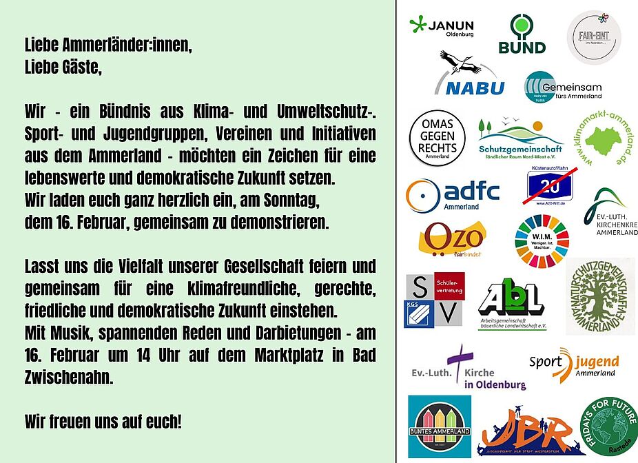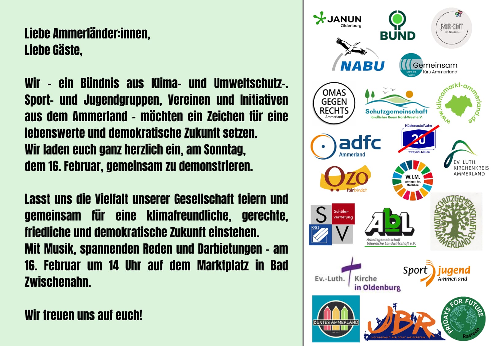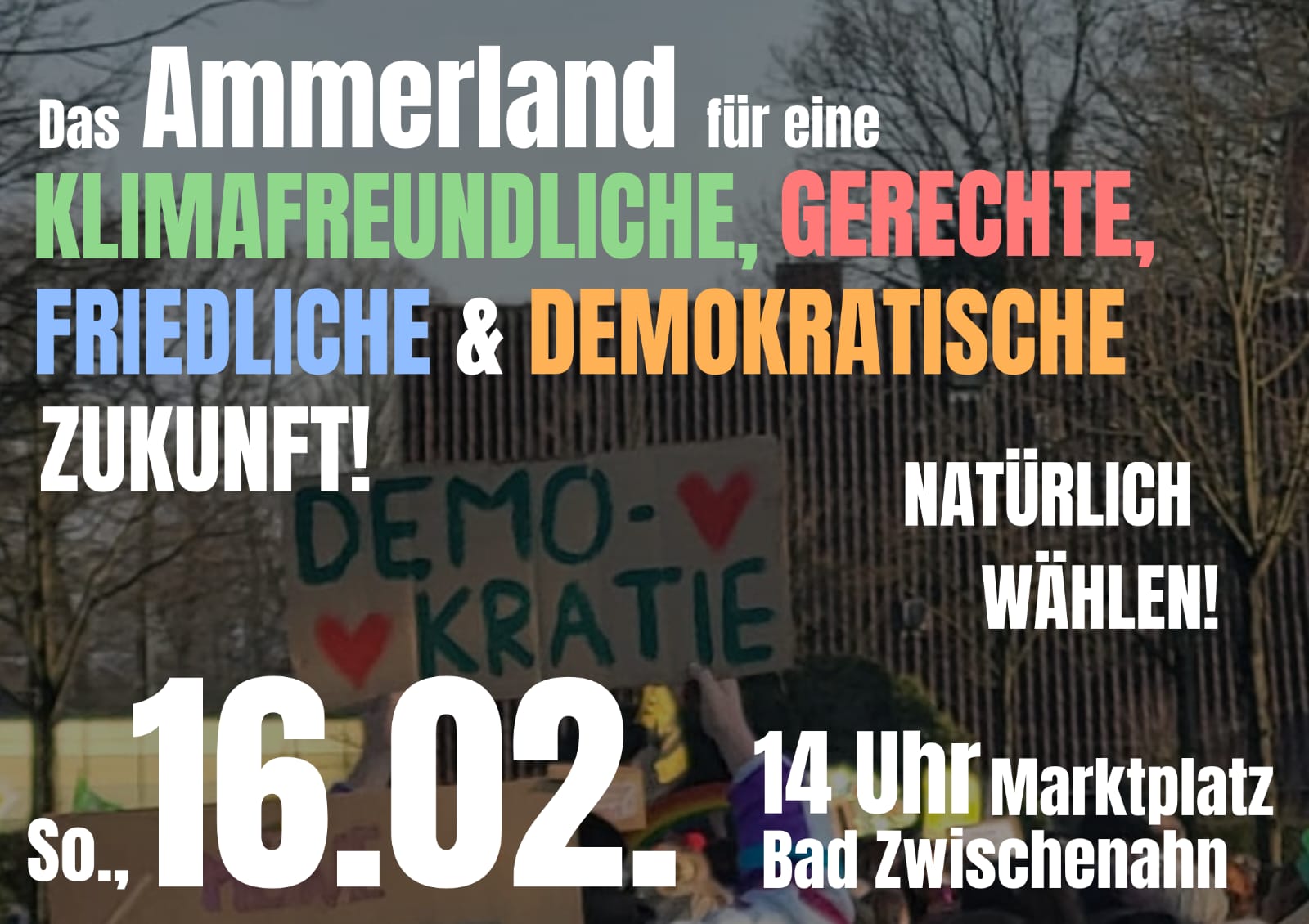 Anlässlich der vorgezogenen Bundestagswahl möchte ein breites Bündnis aus Klima- und Umweltschutz-, Sport- und Jugendgruppen, Vereinen und Initiativen im Ammerland erneut ein Zeichen für eine lebenswerte und demokratische Zukunft setzen. Dazu findet am Sonntag, dem 16. Februar, in Bad Zwischenahn eine Demonstration mit Redebeiträgen und Musik statt. Die Auftaktkundgebung beginnt um 14.00 Uhr vor dem Rathaus. Danach gehen die Teilnehmer*innen etwa zwei Kilometer durch den Ort, die Demonstration endet am Rathaus.